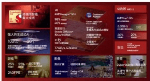 高通新一代的骁龙平台8Gen3 将高性能 AI注入整个系统,将赋能用户创作独特内容、帮助生产力提升,并实现其他突破性的用例,进一步推动端侧AI 的规模化扩展。骁龙 8Gen3采用4nm 制程,相比上一代骁龙8平台,骁龙8Gen3 在NPU 性能上有98%的提升, CPU性能有30%的提升,GPU 性能有25%的提升,整体功耗**10%。骁龙8Gen3 是全球**支持终端运行100亿参数模型的芯片平台,针对70亿参数LLM 每秒能生成20个 tokens,支持不到一秒的时间就能使 用 Stable Diffusion在手机上生成图像。各类AI应用将在搭载骁龙8Gen3的 手机上稳定运行,包括 GPT 聊天机器人、本地实时翻译、极速双语生成、各类虚拟助手等。