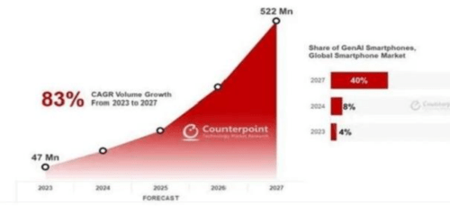 该机构预计, 2023 年生成式AI 智能手机出货量将在4700万支左右,在整体智能手机中占比约4%;2024年出货量有望突破1亿支,占比提升至8%;2027年出货量有望达到5.22亿支,占智能手机比重40%——2023-2027年复合成长率达83%。