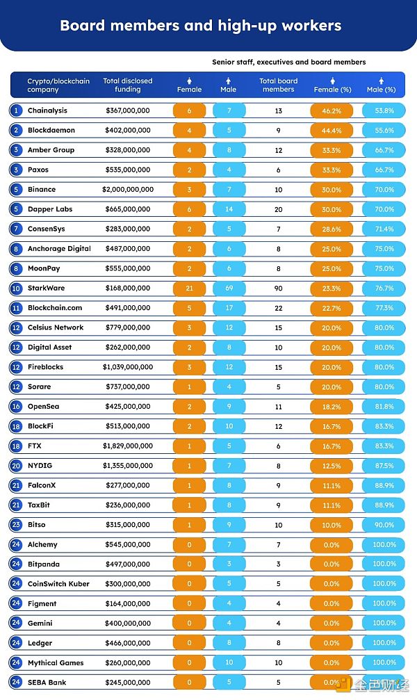 尽管已经取得了一些成功,例如 Chainalysis,其董事会成员中女性比例接近 50%,但仍有许多工作要做。 许多公司都在努力争取超过 20% 的女性代表,甚至董事会或**职位中只有一名女性。