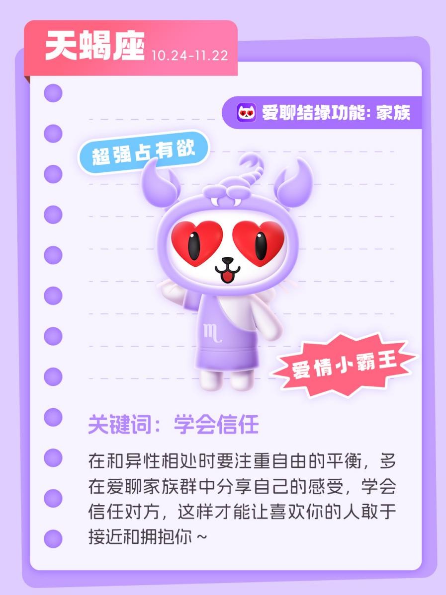 天蝎座性格爱憎分明,也是拥有**占有欲的“爱情小霸王”,但这样会让心动对象认为,他们和你在一起之后会失去时间和空间,因此在爱聊和异性相处时要注重自由的平衡,多在家族群聊中分享自己的感受,学会信任对方,这样才能让喜欢你的人敢于接近和拥抱你。