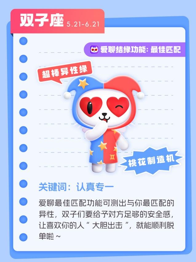 双子座拥有超棒的异性缘,像一个“桃花制造机”,但这也会让你真正的有缘人产生“他是不是对所有人都这么好”的不安全感。爱聊**匹配功能可通过生辰八字测出与你最匹配的异性,双子们再通过私聊散发“认真专一”的单身讯号,让喜欢你的人“大胆出击”,就能顺利脱单啦。