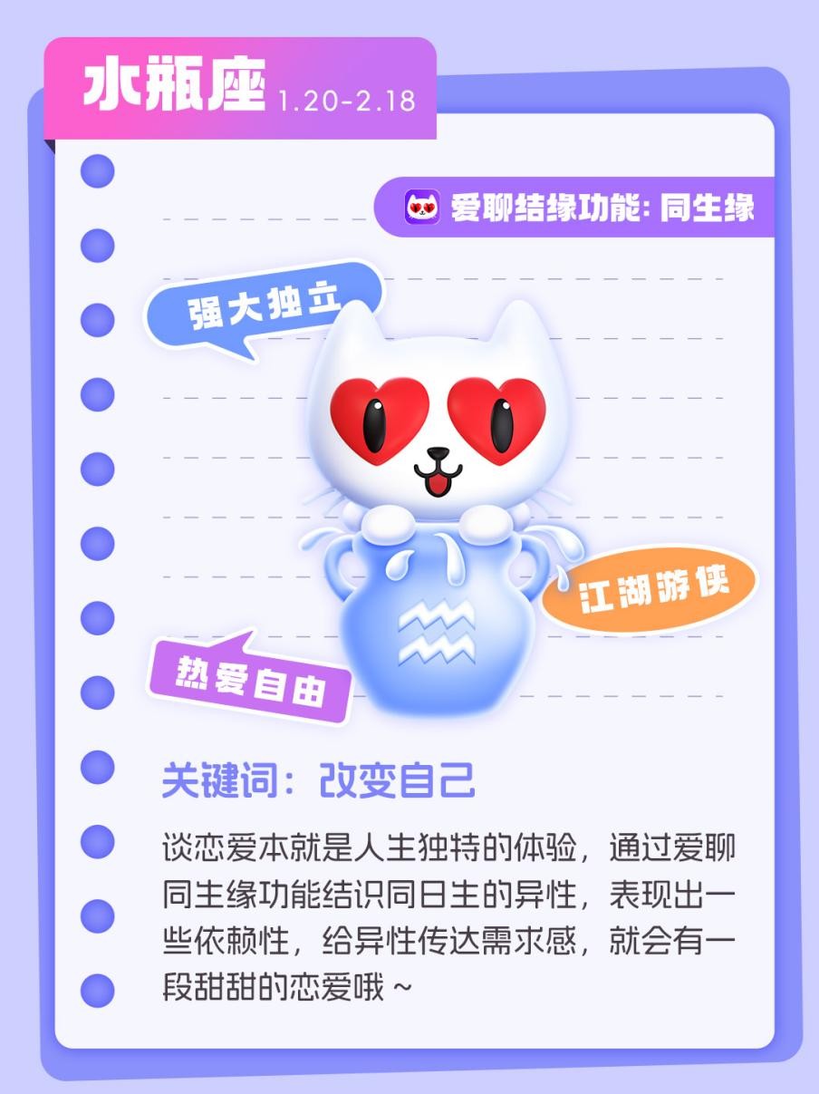 水瓶座是强大而独立的“江湖游侠”,热爱自由的他们对于“被管束”的恋爱生活避之不及,但转念想想,谈恋爱本就是人生独特的体验,通过爱聊同生缘功能,可以结识与自己同日生的异性,拿出自己的高情商,表现出一些依赖性,给异性传达需求感,就会有一段甜甜的恋爱哦。