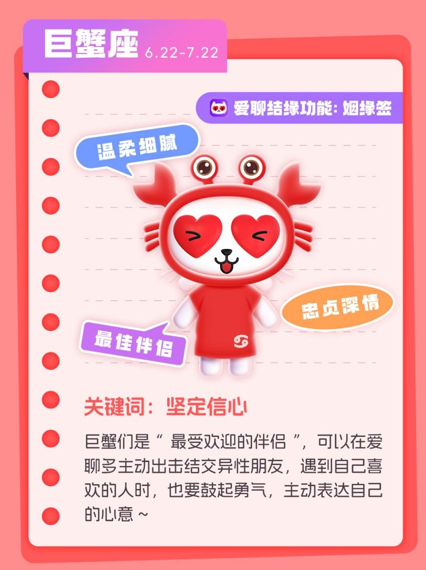 巨蟹座性格温柔细腻,是“最受欢迎的伴侣”,但过于深情的他们也容易在“曾受伤”的经历中走不出来,从此错过许多缘分。因此巨蟹们需要学会走出过往,重拾信心,在爱聊通过姻缘签等功能主动出击结交异性朋友,遇到自己喜欢的人也鼓起勇气,主动表达自己的心意。