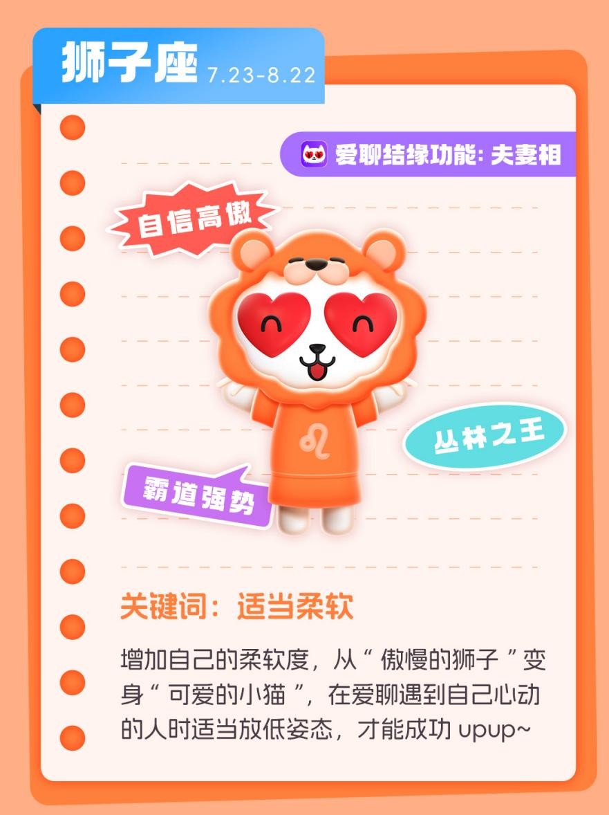 狮子座是自信的代名词,是“高傲的丛林**”,但太过强势的性格也容易让人“退避三舍”,因此增加自己的柔软度,从“傲慢的狮子”变身“可爱的小猫”,在爱聊遇到自己心动的人时适当放低姿态,才能成功率upup~