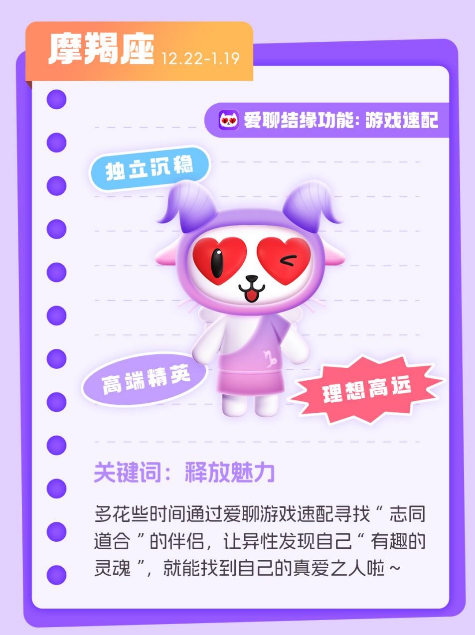 摩羯座通常是“高端精英人士”的形象,过于沉稳的人设和成功的事业会让异性很难发现你内在“有趣”的灵魂,想要脱单,摩羯们需要多花些时间在爱聊寻找“志同道合”的伴侣,通过游戏速配与不同性格的异性相识,让他们看到自己不同的一面,也找到自己的真爱之人。