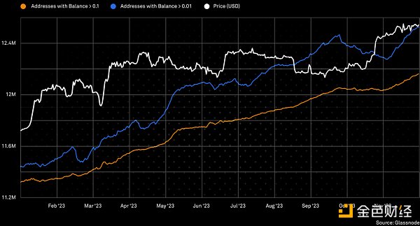 2023 年对比特币来说是具有里程碑意义的一年,标志著比特币转向更广泛采用的转变以及新投资者兴趣的增加。 Glassnode 的数据显示,较小的比特币持有量(超过 0.01 BTC)有所增加,证明了散户投资者的参与度不断增加。 尽管金融市场波动较大,但比特币仍被誉为安全且有吸引力的投资选择,吸引了主流投资者的注意。 这项转变凸显了比特币从一种利基资产到成为主流金融领域关键参与者的历程。