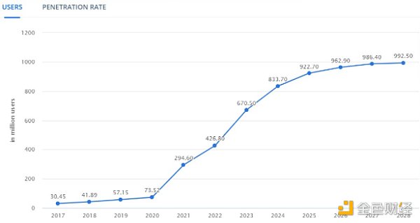 加密货币市场对 2024 年加密产业的用户大幅成长持乐观态度,Statista 估计,根据有利的市场条件,用户数量将在 8.5 亿至 9.5 亿之间。 尽管加密货币在 2023 年面临挑战,但预计产业将持续扩张,到 2024 年用户可能达到近 8 亿,这凸显了全球对加密资产日益增长的兴趣。