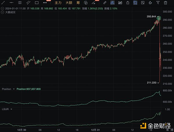 让我们回到LSUR和持仓量的分析上,我们散户喜欢** 扛单,然后在下跌过程中,持仓量上涨,LSUR上涨,意味着散户在接多。