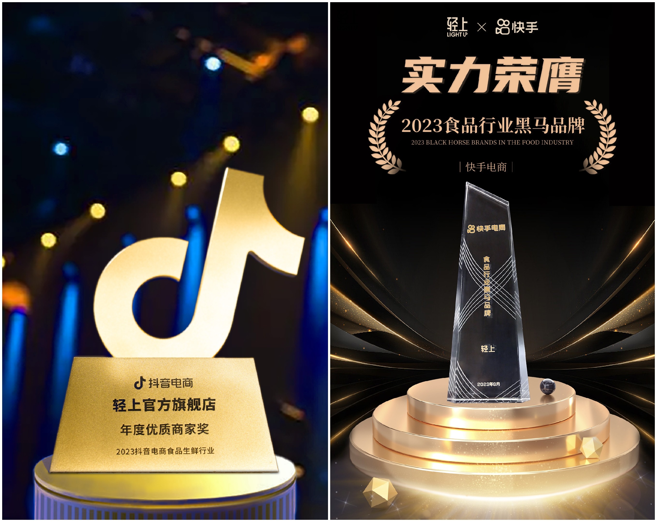 无独有偶,在较早前的11月28日,轻上在抖音电商2024年货节启动大会暨2023年度盛典荣获“年度优质商家奖”。同年9月,获得快手2023食品行业黑马品牌殊荣。轻上能多次从众多参选的品牌中脱颖而出,接连斩获大奖,是行业对轻上团队不懈努力和持续创新的肯定,再度论证了品牌的强劲实力,为未来的发展奠定了坚实的基础。