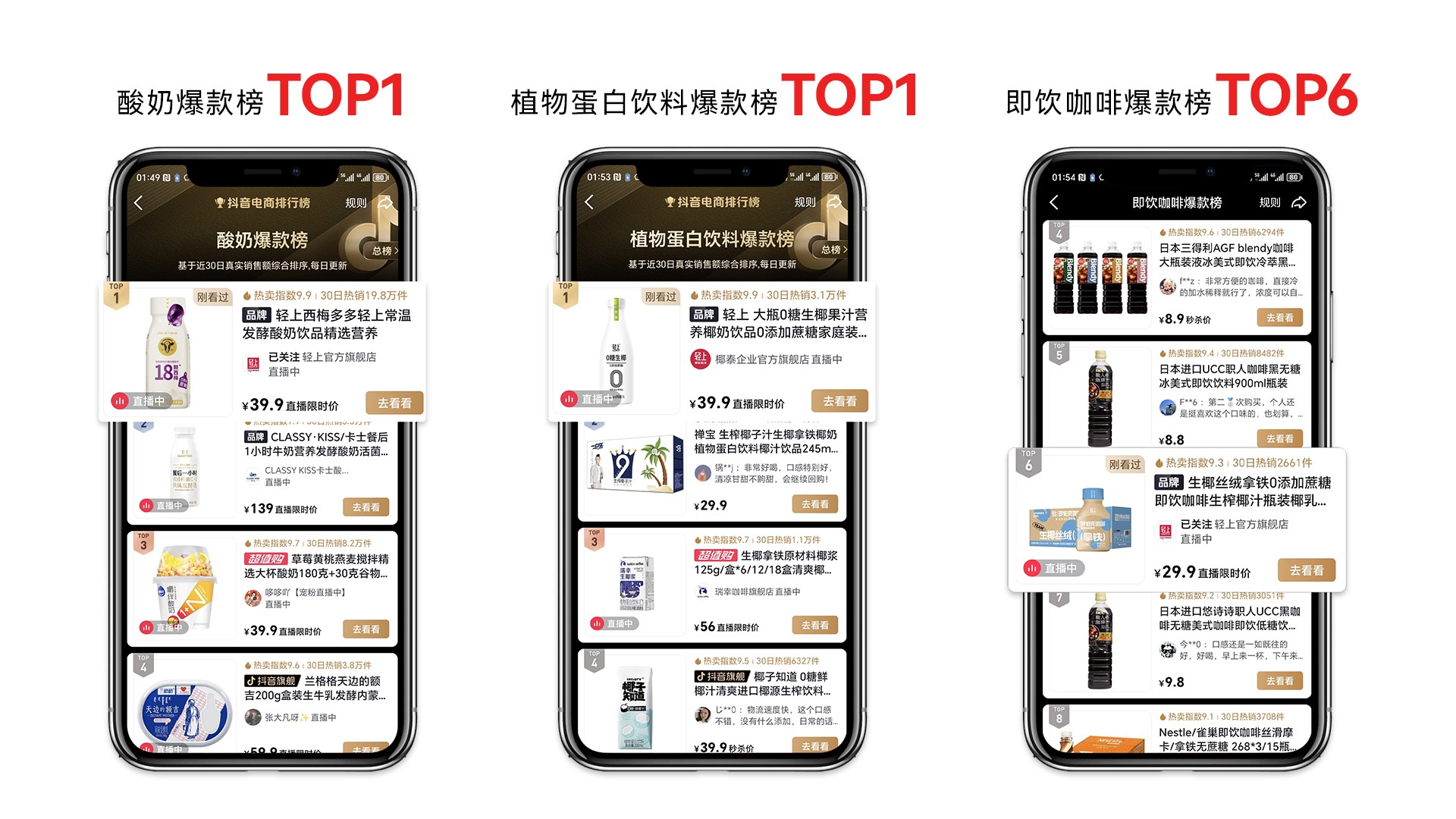 通过深入洞察市场用户需求,结合抖音平台的特点和互动营销活动,不断试水实现消费者品牌心智渗透。轻上成功打造出0糖生椰、西梅多多、西梅乳酸菌、生椰丝绒拿铁、鲜榨玉米汁等多款明星产品!其中轻上解腻神器西梅多多酸奶饮品更是以西梅 酸奶的创新口感引爆业界,累计**2000万 瓶,荣登抖音电商酸奶爆款榜TOP1!!!受到消费者的广泛好评。