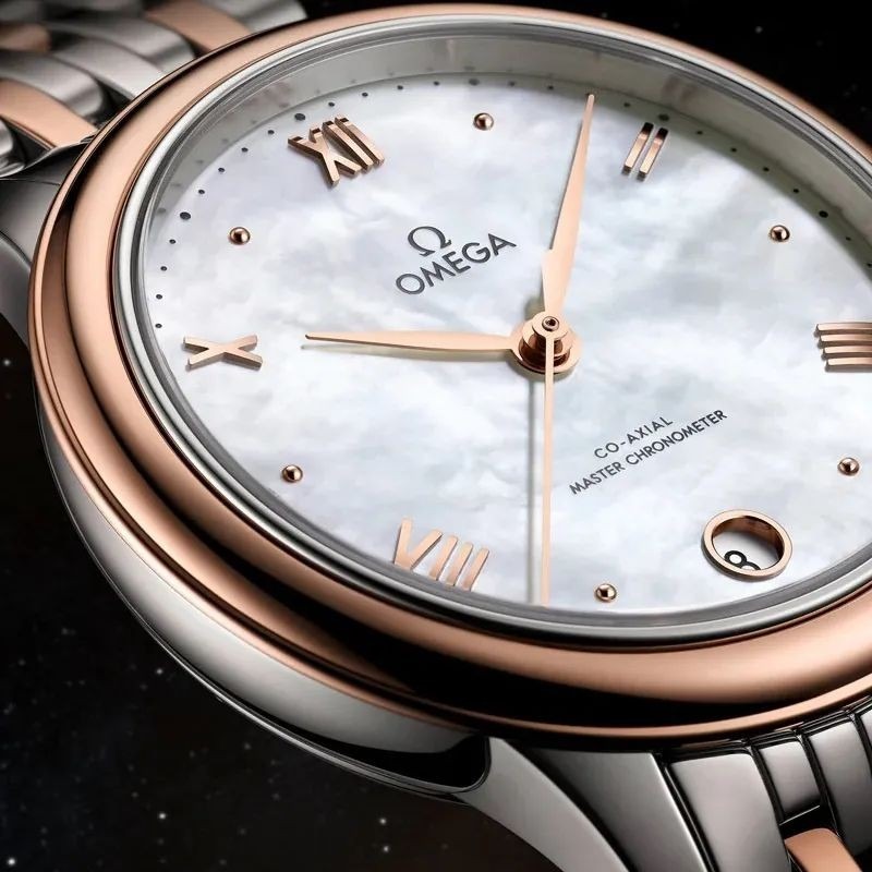 适合女士佩戴的碟飞系列典雅腕表,我推荐这枚34毫米尺寸的间金款式。从这一代表款开始,欧米茄特有的Sedna 18K金**取代了之前手表款式的玫瑰金,包括金质的罗马数字时标,恰当地点缀在体现女性柔美气质的珍珠母贝表盘上。温润而又开阔的表盘大气简洁,却又不失**细节。6点位圆形日期窗口,同样镶有金质的框口,于细节处彰显**与典雅。