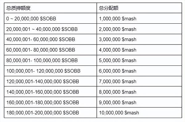 如果是 $SOBB 的总质押量达到180,000,001时,触发分配额度上限(10,000,000 $mash),但仍支持继续质押$SOBB。