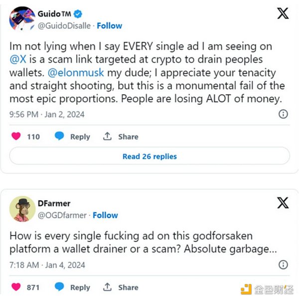 这种情况已经严重到其他 X 用户必须在广告上留下社区说明,以警告其他人这些广告是**或钱包流失者。