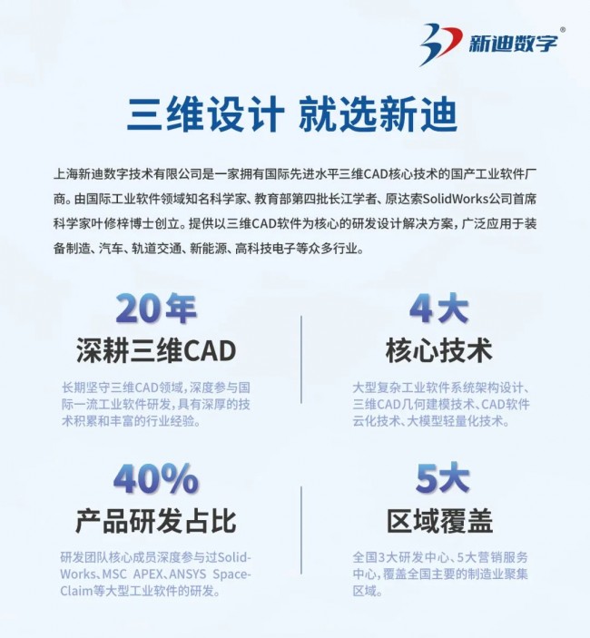 新迪数字是一家具有二十年三维CAD软件研发经验,拥有**先进水平研发创新能力的国产三维CAD软件厂商,历经多年研发积累,在大型复杂工业软件系统架构设计、三维CAD几何建模技术、CAD软件云化技术、大模型轻量化技术领域拥有****的自主核心技术。同时拥有图纸通、3DSOURCE零件库、3D轻量化引擎等多款SaaS工业云软件,为制造业提供一体化研发设计协同解决方案,受到市场广泛认可。