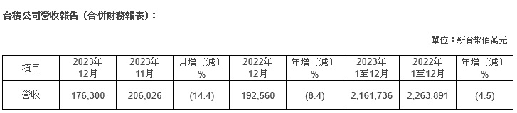 台湾积体电路制造股份有限公司今日(1月10日)公布2023年12月营收报告,2023年12月合并营收约为1763亿元新台币,较上月减少14.4%,较上年同期减少8.4%。2023年1至12月营收约为2.16万亿元新台币,较上年同期减少4.5%。