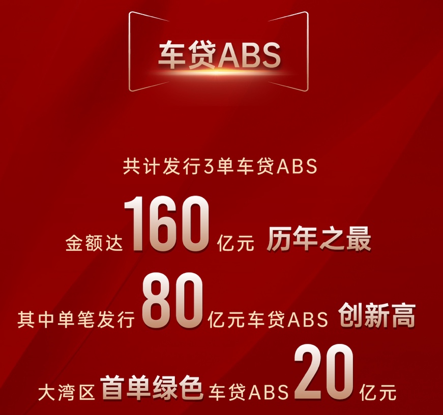 广汽汇理汽车金融2023年共计发行3单车贷ABS,累计年发行金额达160亿元,为历年之最;其中包括:自身首单也是粤港澳大湾区首单绿色车贷ABS(汇聚达2023年**期个人汽车抵押**绿色资产支持证券),发行规模20亿元;以及2023年第三期ABS(“汇聚融23-1”个人汽车抵押**资产支持证券),发行金额高达80亿元,创下了广汽汇理汽车金融单笔发行金额的历史新高。
