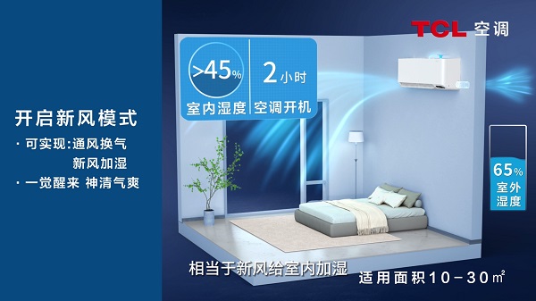 同时,可实现通风换气的基础上,可快速提升室内空气湿度到45%以上,营造舒适的呼吸环境。以65%的室外湿度环境为例,传统空调运行时,密闭房间空气不流通,室内湿度快速下降,开机约2小时,室内空气的相对湿度由65%下降到40%以下。而TCL新风空调空调开启新风功能后,开机2小时,室内空气的相对湿度持续保持在45%以上,让人一觉醒来神清气爽。