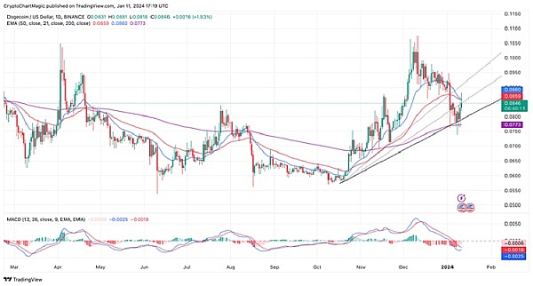 狗狗币($DOGE)价格昨日从0.075 美元的支撑位反弹,一度触及0.85 美元的高位,截至撰稿时报0.8394 美元,200 天指数移动平均线(EMA)(紫色)上方的反转讯号,说明多头正在尝试取得优势。