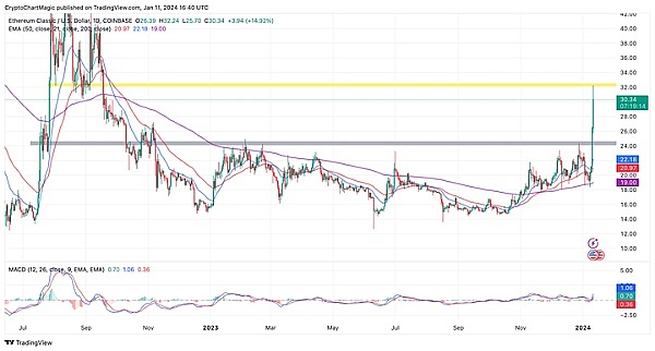 本月,以太坊经典(ETC)价格**超过50%,一度触及32 美元的高点,在此之前ETC 与以太坊、XRP、Solana(SOL)等**加密货币相比一直屈居劣势,但本月的涨幅证明了ETC 的上升潜力。