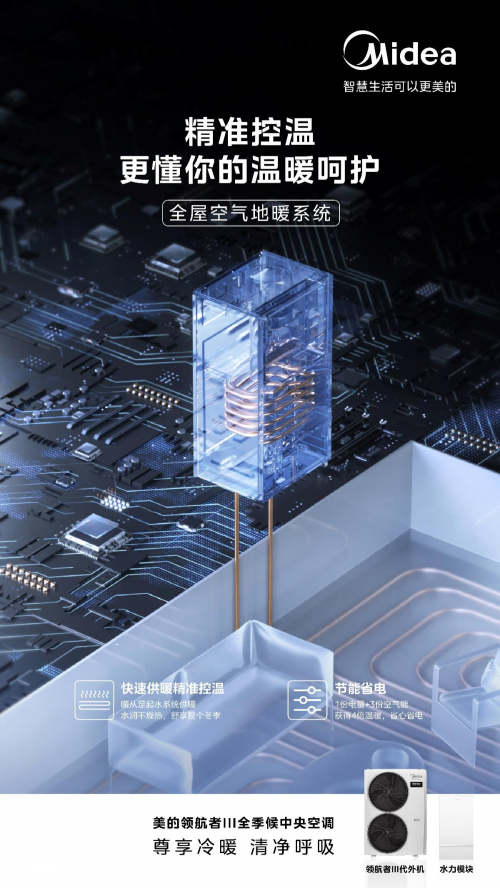 此外,美的**者III全季候**空调采用的空气源热泵水暖技术能将温度提升至60℃,加速暖房过程。它的联控调温功能能根据室内需求自动调节温度,既提供舒适环境,又节能。全屋新风系统采用**全热交换和独立新风换气技术,提供双向新风供应。专业的健康系统采用日光氧多效净护技术,释放羟基自由基消杀常见**和病毒,保障室内空气洁净。其全屋加湿系统通过四重洁净高温蒸汽加湿技术,实现100℃蒸汽**和健康加湿,有效提升室内湿度和舒适度。