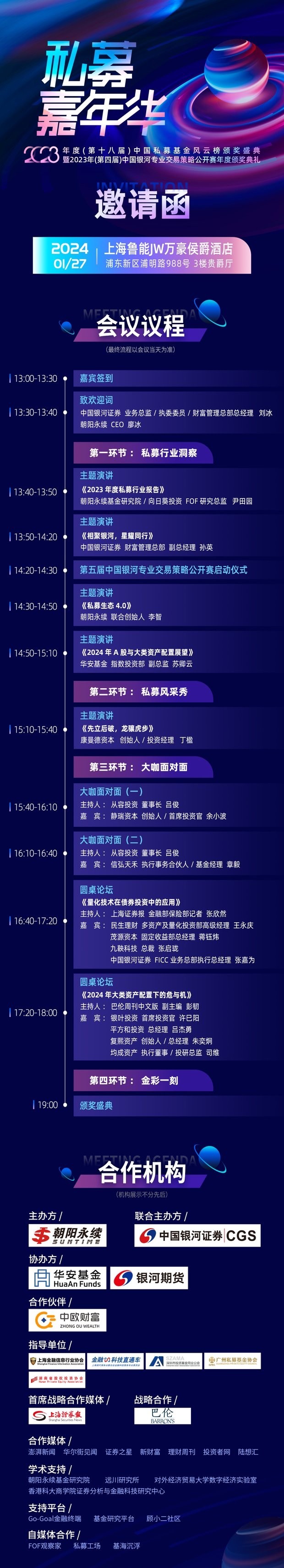 由朝阳永续主办、**银河证券联合主办、华安基金及银河期货协办、中欧财富合作支持的2023年度(第**)**私募基金风云榜颁奖盛典暨2023年(第四届)**银河专业交易策略公开赛年度颁奖典礼将于2024年1月27日在上海举办。届时来自私募、公募、券商、银行等近千位行业精英齐聚一堂,共飨投资盛宴。