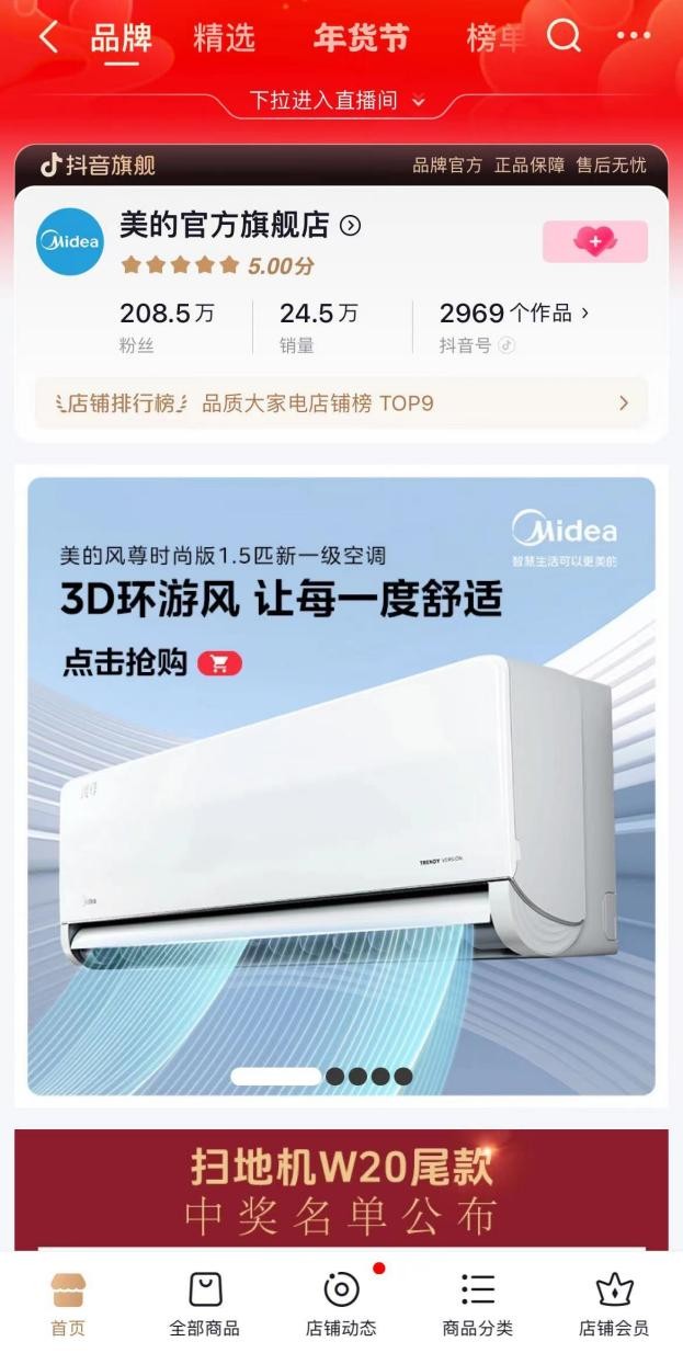 作为家电头部品牌,美的早在2020年就开始发力抖音电商,通过布局全渠道、优化内部架构、整合多场域资源,打造**用户链路,实现了从短视频种草到转化的**覆盖。截止目前,美的已在抖音电商构建超过300个动销店铺,稳居家电行业店铺数量**。