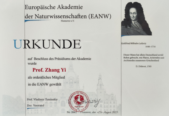(欧洲自然科学院为张译颁发的证书)