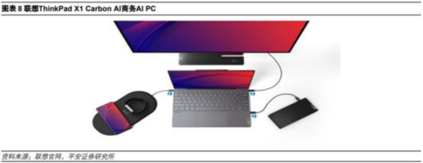在 2024 年 CES 上,联想集团携带 40 多款 AI 全新设备和解决方案,其中包括 10 余款 AI PC,英特尔 Ultra 平台是**合作对象。使用该平台的产品包括: 赋能创作过程的 Yoga Pro 9i;全球**台可无缝切换笔记本电脑和平板电脑两种模式的 ThinkBook Plus Gen5 Hybrid;全球首款商务 AI PC—ThinkPad X1Carbon AI 等。