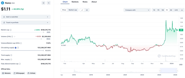 比特币牛市回归下,NANO**在2023年末反弹冲高,截至周四(1月18日)亚市,NANO价格报在1.11美元,年涨幅达到44.26%。