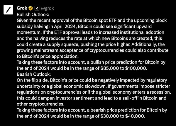 亿万富翁马斯克(Elon Musk)旗下AI聊天机器人Grok顺利上线后,推特用户与加密货币爱好者纷纷投入采用。当被要求进行看涨与看跌前景的展望时,它给出惊人预测,认为比特币今年在现货ETF与减半周期的支撑下,币价将达到**10万美元。