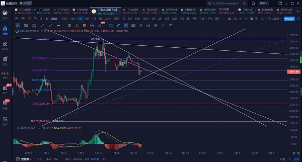 以太坊上个交易日白盘整体处于震荡上行过程中,晚盘从2549附近开始回踩2500附近反弹2535附近再次下跌,凌晨更是跌至2426附近才止住跌势反弹,现行情位于2460附近震荡。
