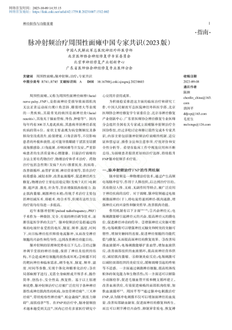 在**人民解放军总医院神经外科医学部、北京医师协会神经修复学专家委员会、北京市神经修复产业创新**、广东省医师协会神经修复专业医师分会的支持下,陈琳博士联手**50余名专家制定了《脉冲射频**周围性面瘫**专家共识(2023版)》,以利于脉冲射频**的规范开展。该共识在起草阶段得到**外神经外科领域专家的高度肯定,被认为是面神经疾病**领域的开拓之举,也是**部详细论述脉冲射频**的专家共识。
