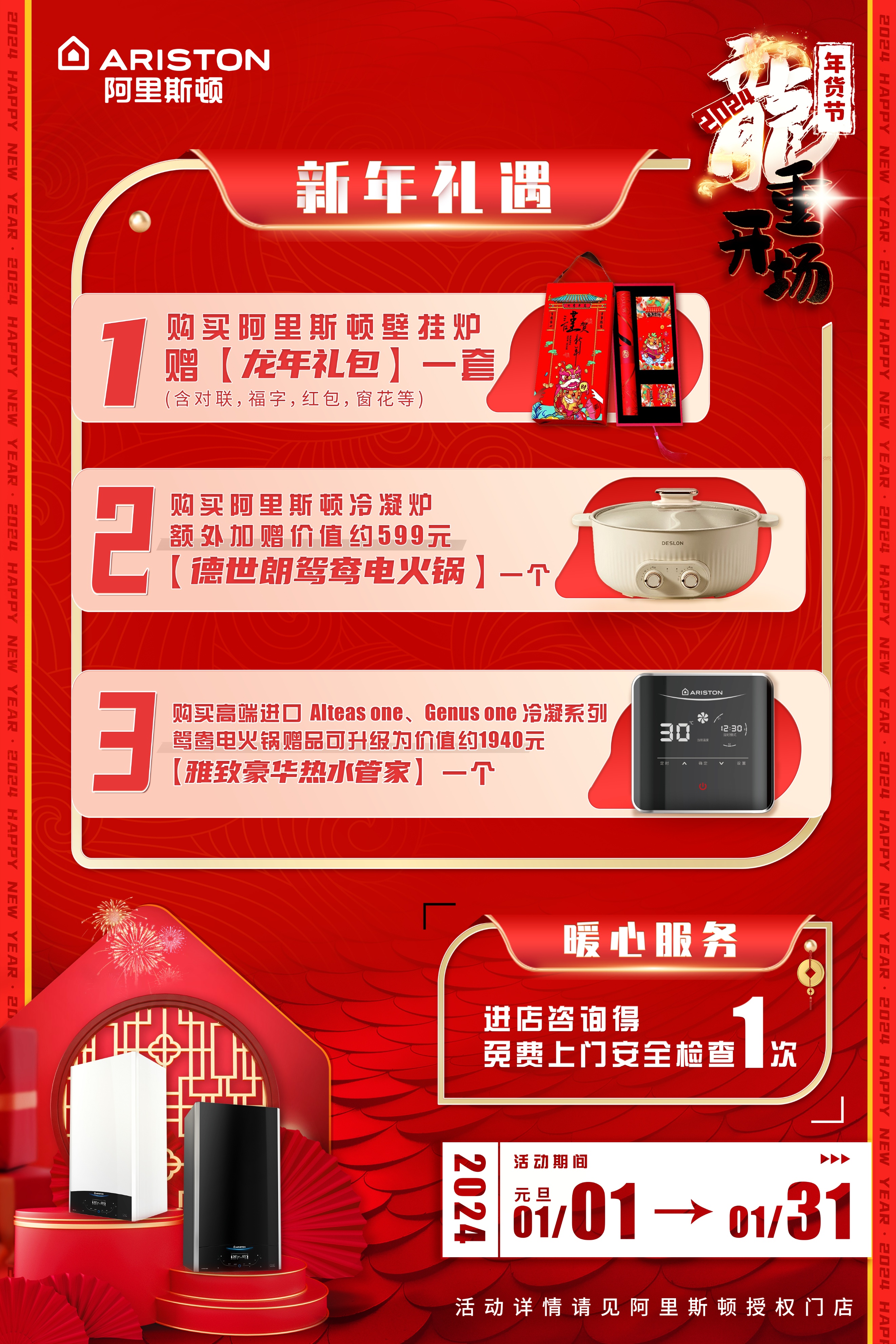 2024年1月1日至2024年1月31日,凡前往阿里斯顿指定授权门店,进店咨询可获得热水采暖免费上门安全检查一次;凡选购阿里斯顿壁挂炉的消费者,可得龙年礼包一套;凡活动期间购买阿里斯顿冷凝炉的消费者,可额外加赠价值约599元的鸳鸯电火锅一个;凡在活动期间购买高端进口Alteas one或Genus one冷凝系列的消费者,可将鸳鸯电火锅赠品升级为价值约1940元的雅致豪华热水管家一个。让家温暖如春,丰富豪礼等您来拿!具体规则详见活动海报,也可咨询阿里斯顿壁挂炉指定授权门店。
