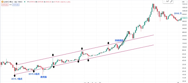 或者目前比特币的通道和2015年的这波牛市非常的相似 我们可以看一下他也是在底部的位置 或者是后面比特币起来之后在2015年的6月份 也是两个低点就可以形成一个上升趋势的通道 这边也有黑天鹅事件被跌破 但是这边**起来 底部突破之后