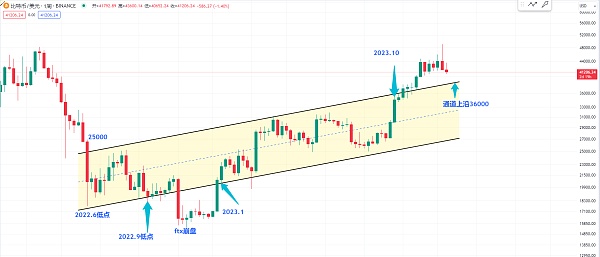 然后我们再看一下2023年10月份到11月份 我也是给大家讲过 有可能这个通道 就是这边有一个交易所崩盘我们先不看 比特币在2022年的6月份也是有一个低点 或者是2022年的9月份 包括当时没有黑天鹅事件之前的这几个低点 跟这个25000也是形成了一个平行的上升通道