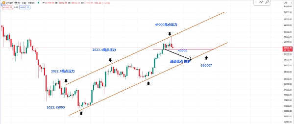所以既然2023年10月份的这个位置既然是突破了 而且他也是一直在上涨 那我们去观察一下目前这个通道上沿的位置 大约也是在36000附近 所以如果这个40000万一跌破 我们就去观察一下有没有可能再次回踩这个通道上沿的位置 有可能也是一个非常不错的买点