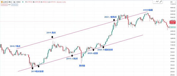 而且我们可以看一下历史上在2019年的牛市 当时低点的两个支撑形成的一个上升通道 后面这个黑天鹅不用去管 就是当时比特币来到2019年的12月份 这边也是低点 其实都是在守住这个支撑 有可能就会在这个位置开启一波牛市