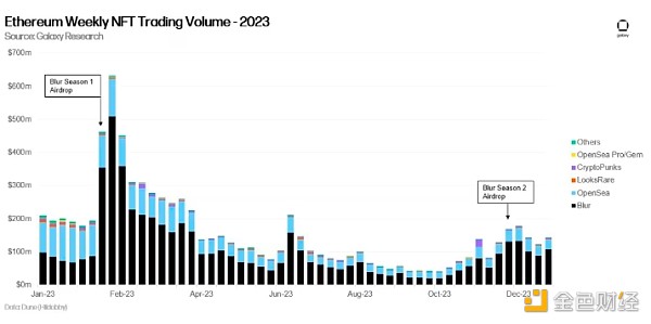 在2023年,Blur占据了以太坊总NFT交易量的67%。在Blur推出之前曾在80%以上的NFT交易量上占主导地位的OpenSea,在总以太坊NFT交易量中仅占29%。