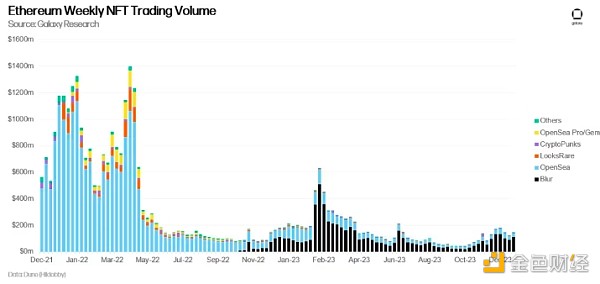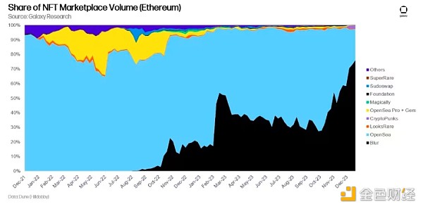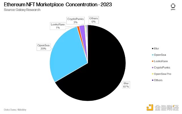 2023 年,Blur 占据了以太坊 NFT 交易总量的 67%。 在 Blur 推出之前,OpenSea 曾占据 NFT 交易量 80% 以上的份额,但同年仅占以太坊 NFT 交易总量的 29%。