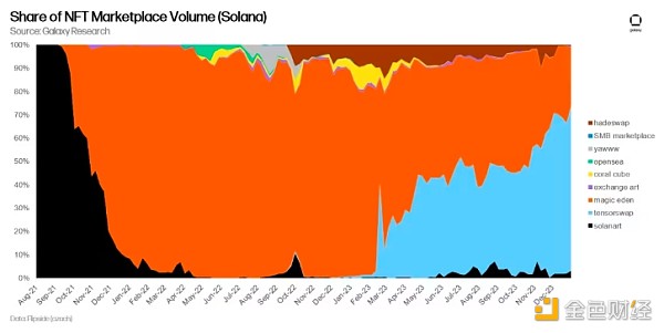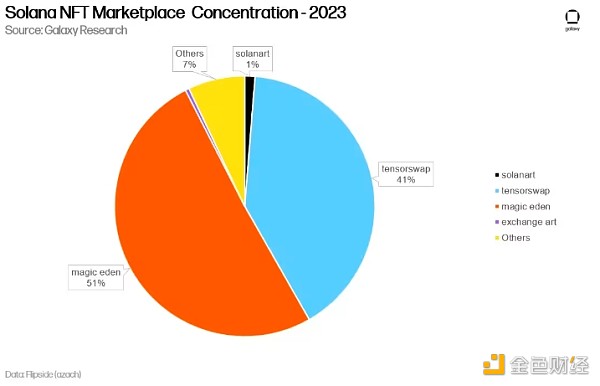 在2023年,Magic Eden主导了Solana的NFT交易市场,占据了总交易量惊人的51%。然而,获得第二名的是Tensor,在同一年内占据了Solana NFT交易量的41%。
