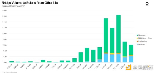 Solana的NFT交易量将在2024年继续与以太坊的NFT交易量竞争。自2023年12月1日以来,已经有5050万美元的资金从其他区块链(包括Avalanche、BNB Smart Chain、Arbitrum和以太坊)转移到了Solana。尽管流入Solana的新资本可能是由Solana去**化金融(DeFi)应用提供的空投和收益驱动的,这些资本可能会在激励发生变化时快速退出生态系统,但我们可以预期一部分新资本将流入Solana的NFT市场。根据截至2023年12月的新资本流入情况,取决于以太坊NFT的复苏速度,Solana的NFT交易量可能在2024年达到总NFT交易量的30%-50%。