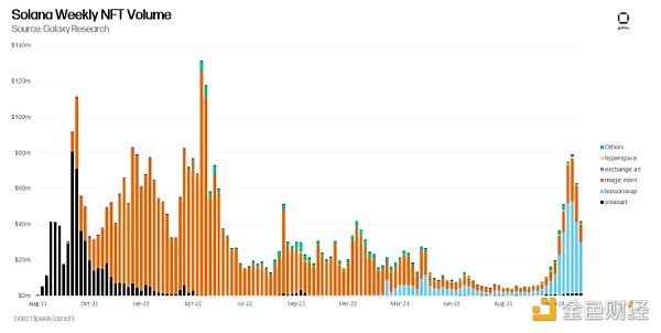 Solana的NFT交易量也在2023年9月触底,当月交易量为3000万美元。从2023年10月9日到10月16日期间,Solana NFT的交易量为**,仅产生了430万美元的交易量。自2023年10月16日以来,Solana的NFT每周交易量增长了超过10倍。Solana NFT每周交易量的显著增加主要归因于两个主要因素: