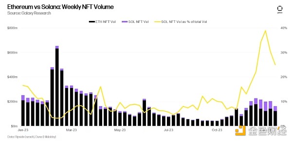 Solana NFT在2023年5月至9月期间面临与以太坊NFT竞争市场主导地位的激烈竞争。在此期间,Solana NFT的交易量占整体NFT交易量的不到10%。然而,Solana NFT在2023年11月终于找到了发展的契机,并在此后迅速获得了NFT交易量市场份额。到了2023年12月,每周Solana NFT交易量占总NFT交易量的至少22%到37%。
