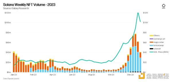 Tensor是Solana版本的Blur,于2022年推出,NFT交易者可以制定复杂的交易策略。Tensor的第二季空投于2023年8月结束,他们的下一个空投预计将在2024年1月左右进行,因此,Solana NFT收藏家正在增加交易活动以获取积分。推动Solana的NFT生态系统的更为关键的影响是Solana持有者正在经历的财富效应。随着SOL在2023年上涨615%,以及其他Solana应用慷慨的空投被分发给社区,Solana的活动在各种应用类型中都有所增加,包括NFT。