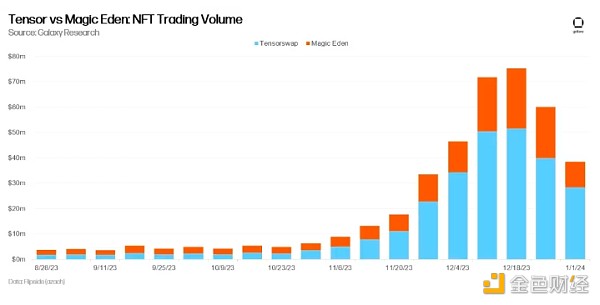 尽管Magic Eden在2023年**于Tensor,但在今年的一些日子里,尤其是在2023年10月NFT市场复苏期间,Tensor的交易量超过了Magic Eden。从2023年10月1日到2024年1月1日,Tensor显著**,交易量比Magic Eden多了50%。