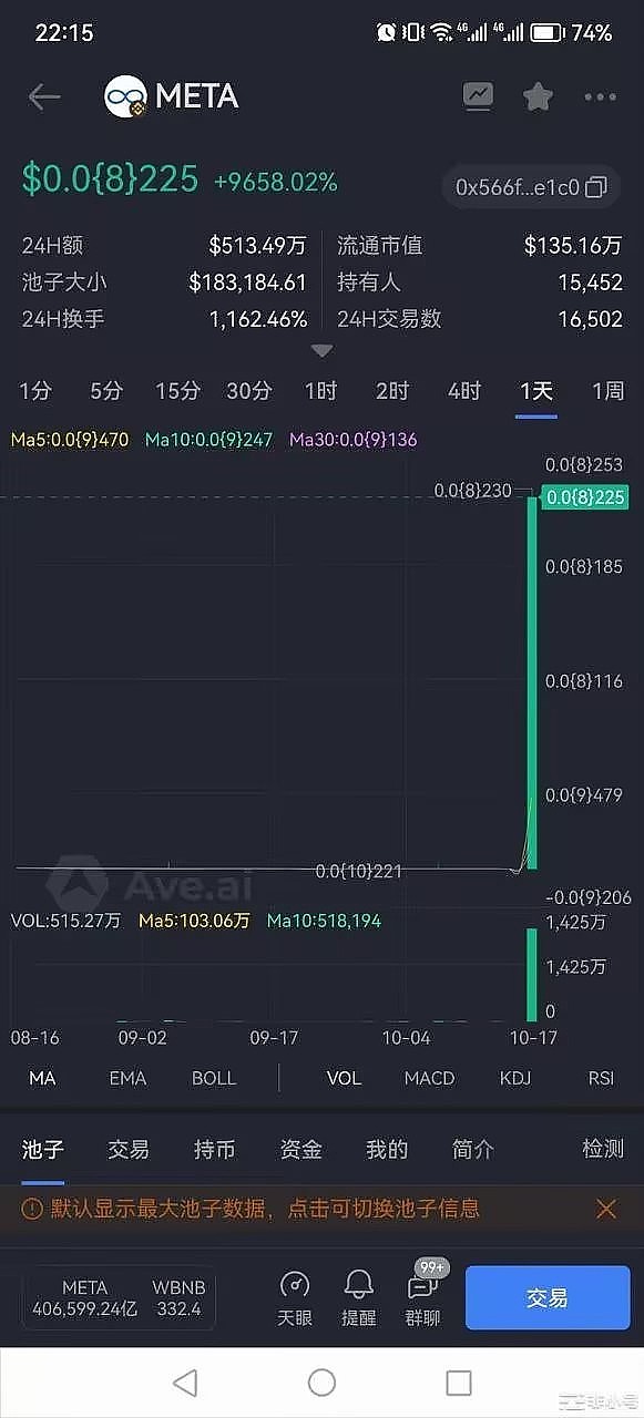 推荐一个被放弃的AI概念memeMeta项目方的新项目,推出半年跌了一百倍,只有2000多美金市值,池子虽小,拉起来倍数高。Meta曾经也是放弃半年之后,突然爆拉了几百倍,截图是Meta当时爆拉的K线。Meta当时的池子也差不多。项目名字叫 Meta AI,**名是AI,非常好蹭0税,bsc链的,合约地址:0x138be07ebbe230378de430b992709078d69412d2