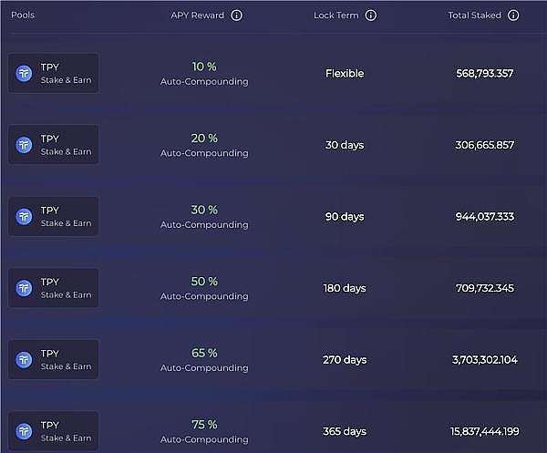 协议的整个经济模型不**且没有收入,只拥有一个质押挖矿的Dapp——在ETH\Arbitrum上质押tpy。长期以来,也只是通过吸引散户质押**锁仓来控制tpy的流通盘,来减小拉盘的阻力。而挖矿收益的分布也**简单**,根据不同的锁仓时间来获得对应的币本位挖矿奖励。