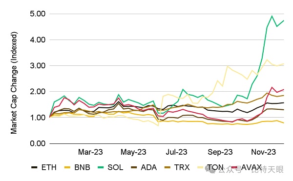 Solana是2023年表现最出色的,尤其是11月份SOL**的市值增长了56%左右。Toncoin今年也取得了长足的进步,其中OpenNetwork在9月份宣布与Telegram合作是一大亮点。