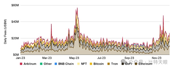 随着行业的成熟和协议向创收方向发展,**加密项目产生的费用将成为一个需要遵循的重要指标。2023年费用稳步上涨。11月,各行业排名前20的加密货币项目的费用比1月高出88%以上。