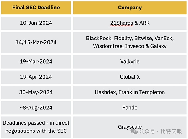 这一有利的裁决促使许多其他参与者,包括全球**的资产管理公司贝莱德,以及富达和景顺,在接下来的几个月里提交了自己的现货BTCETF申请。目前,共有13只现货BTCETF申请正在接受SEC审查。其中,最早的**截止日期为2024年1月,最晚的为8月。